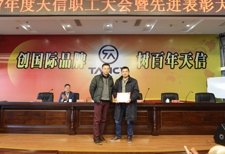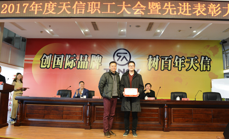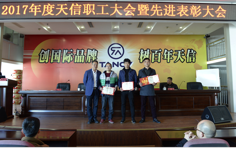 2月5日,2017年度天信职工大会暨先进表彰大会在公司二楼大型会议室召开,会议由副总裁张华主持,公司总裁范叔沙,副总裁叶朋、仇梁以及全体员工共360多人参加。本次会议既是一次总结表彰会,也是一个继往开来的动员会。