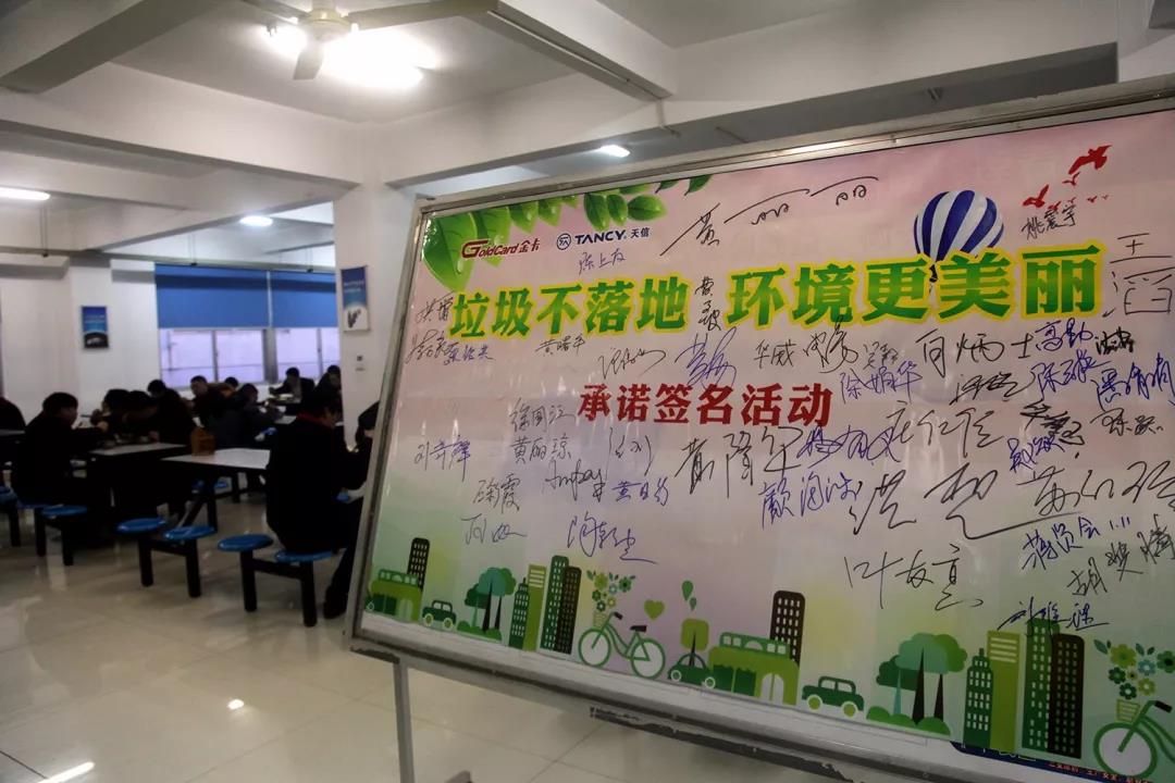 期间,天信党委还利用午餐员工聚集的时间,组织员工在食堂进行了垃圾不落地、环境更美丽的全员承诺签名活动。