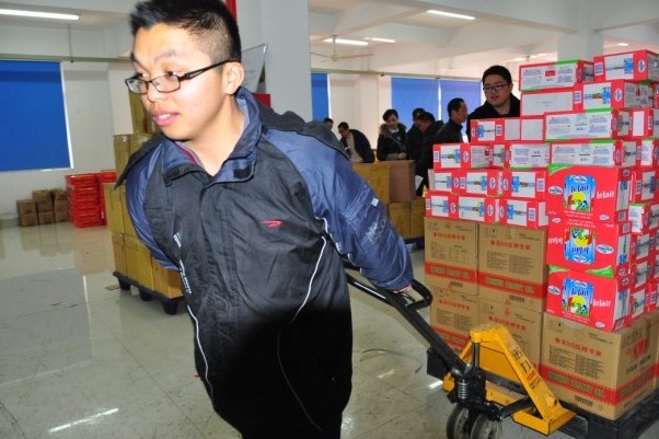 本网讯:1月23日,在公司的员工食堂里,员工们正在高兴地领取年货,准备回家过年。公司为员工们准备了油、牛奶、年糕、水果和坚果等年货,其中不乏苍南本地的特产,让员工们开开心心过春节。